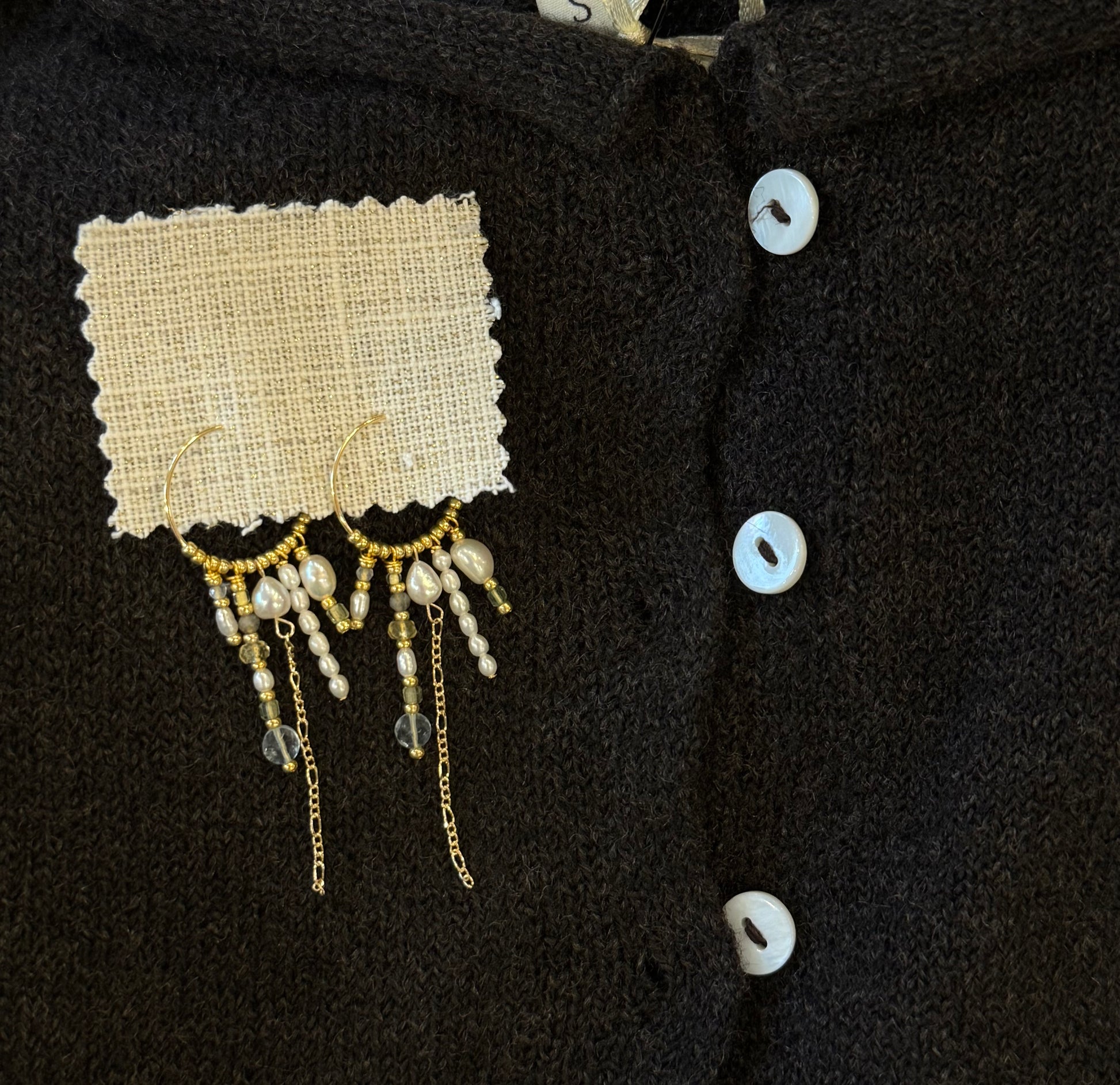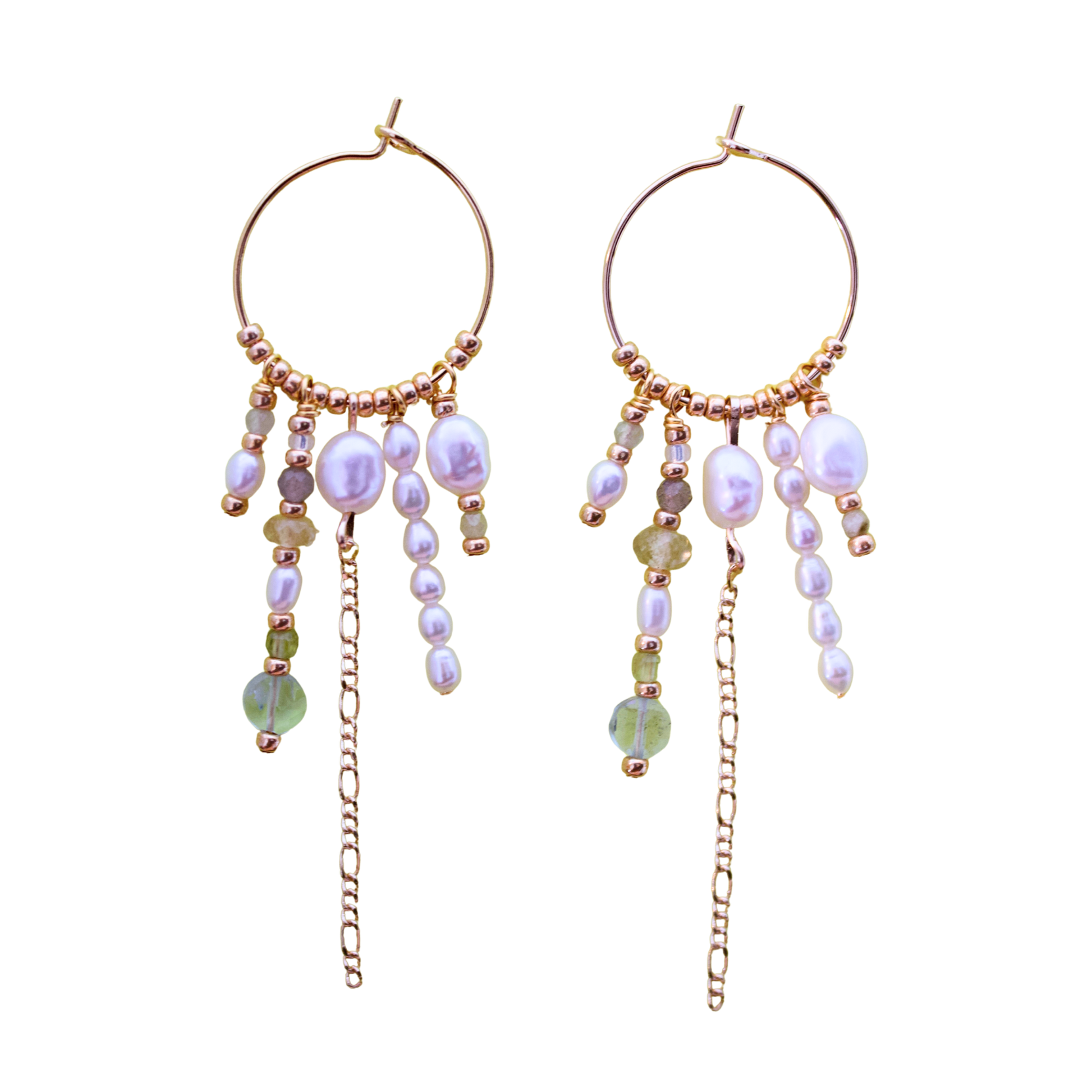 Thin gold filled hoops adorned with freshwater pearls and genuine gemstones. The natural gemstones may vary in shape, size, and color. Dainty gold-filled chain detail. These are delicate, treat with care.